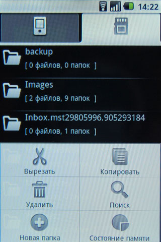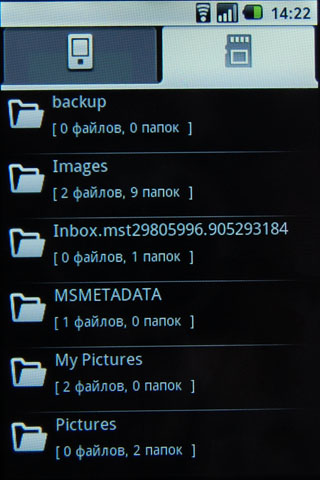 В меню телефона можно найти «Диспетчер файлов». В верхней части экрана программы отображаются иконки, отвечающие за запуск диспетчера внутренней памяти и microSD. Внутренняя структура представляет папки и файлы. На каждой папке указывается количество входящих в нее файлов и папок. У файлов отображается дата создания, время, и объем.