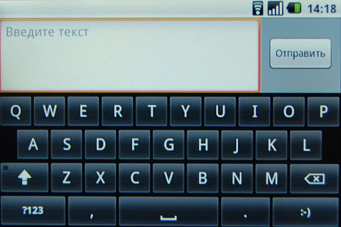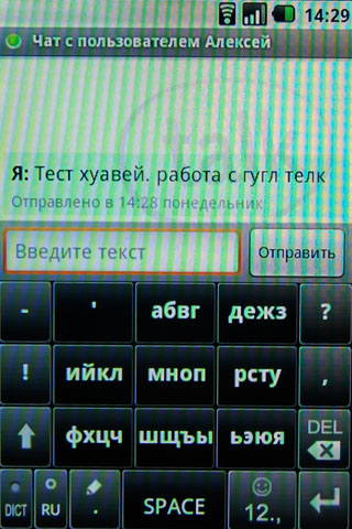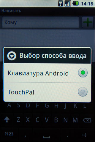 В верхней части экрана предлагается добавить абонента, а в нижней части - ввести текст. Если подольше удерживать нажатие на поле ввода текста, то можно выбрать способ ввода: клавиатура Android (полноразмерная клавиатура, работающая как в альбомном, так и портретном режиме) или TouchPal (стандартная клавиатура, как телефонах с несенсорными экранами). В полноразмерной клавиатуре не обнаружилось русских символов, возможно, я не смог их найти, хотя и "перелопатил" все меню. Но в TouchPal клавиатуре русские символы присутствуют.