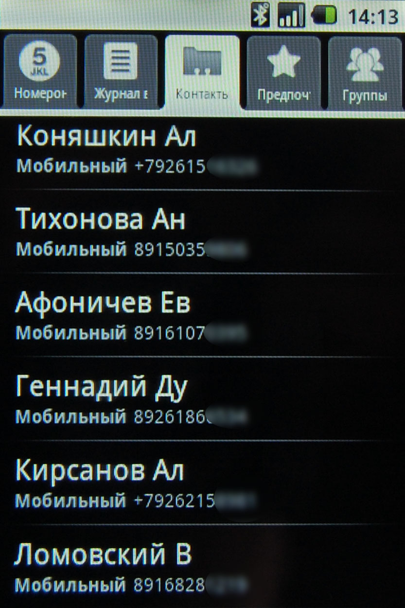 Контакты – в верхней части отображается поисковая строка, ниже – имя и фамилия контакта с номером телефона