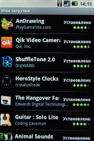 Здесь у меня возникли некоторые проблемы, связанные с необходимостью «получения прав на Root». Так что, некоторые приложения я установить не смог. Зато получил большое удовольствие от закачки и установки работающих приложений (благо, их очень много). Android Market позволяет легко найти нужную программу или скачать ту, что рекомендует магазин. Бесплатных приложений – море, буквально, на любой вкус. После общения с устройствами на базе WM, Andorid мне показался настоящей сказкой. Одна установка приложений в два клика достаточный повод, чтобы перейти к на эту ОС! Многие приложение снабжены комментариями, некоторые из которых на русском языке. Помогает в выборе программ их рейтинг, представленный в виде звездочек по пятибалльной шкале.