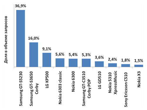 Как и месяц назад, в рейтинге участвовали 35 производителей сотовых телефонов, количество моделей увеличилось на 11 и достигло 551 единицы. Моделью месяца с постепенно уменьшающейся популярностью стал смартфон Nokia 5530 XpressMusic – 10.8% (-3.1%). Тройка лучших телефонов от финского вендора (Nokia 5530 XpressMusic, Nokia 5230, Nokia 6700 classic) владела 26% запросов, аналогичная тройка от Samsung (Samsung GT-S5230, Samsung GT-S3650 Corby и Samsung GT-S5230W Star WiFi) имела 16.1% запросов. Пятёрка популярнейших телефонов набрала 39.6% всех запросов.