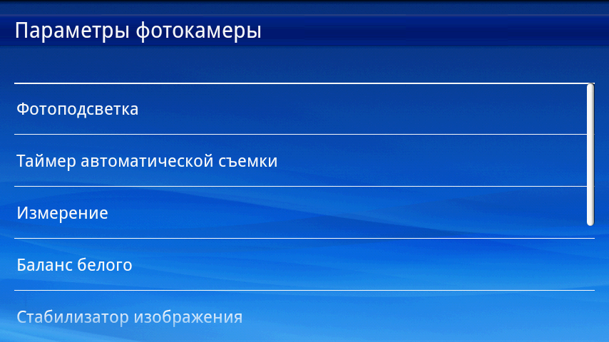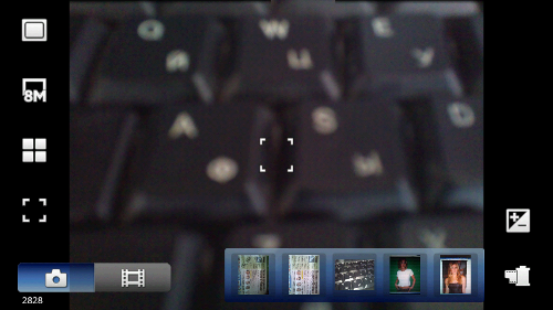 Интерфейс съемки изменен по сравнению со стандартным для ОС Android. Видоискатель занимает центральную часть экрана, по бокам остается место для статусных значков и кнопок. В левом столбце - четыре кнопки. Первая – режим захвата изображения. Здесь есть обычный режим, который подходит для дневной съемки, режим распознавания условий съемки – сюжетная программа выбирается автоматически, распознавание улыбки – съемка происходит как только аппарат определит, что фотографируемый человек улыбнулся, съемка нажатием на экран – при касании экрана происходит фокусировка в этой точке и съемка без нажатия кнопки камеры. Вторая кнопка – выбор разрешения. Предусмотрены следующие варианты: 8 Мп и 2 Мп для стандартного соотношения сторон кадра 4:3, а также 6 Мп и 2 Мп для широкоэкранного соотношения 16:9. Третья кнопка – условия съемки, или сюжетная программа. Здесь можно установить такие режимы как портрет, пейзаж, ночная съемка, ночной портрет, пляж и снег, спорт, вечеринка, документ. Наконец, четвертая кнопка – режим фокусировки: единая фокусировка (по центру), мультиавтофокусировка (по 5 точкам), макросъемка (от 5 см), распознавание лиц, бесконечность. В правой части экрана могут располагаться значки выбранных сюжетных программ и настроек, а изначально там присутствует только кнопка поправки экспозиции, от -2 до +2 ступеней. В нижней строчке - кнопки переключения в режим съемки видео, счетчик кадров, миниатюры последних пяти снимков, кнопка перехода в галерею. При желании все обозначения можно скрыть, это делается через контекстное меню. Там же находится кнопка для перехода к расширенным настройкам. К ним относятся: подсветка, автотаймер, замер экспозиции, баланс белого, стабилизация изображения, "степень" улыбки, геотег, звук затвора (можно отключить), сброс настроек.
