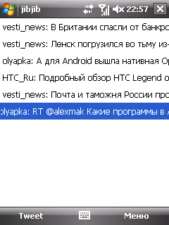 Если говорить формально, то J1ck.Tweet разделил первое место с Twim. Но, субъективно, эта программа разделила первое место с Twim не заслужено. Во-первых, в ней нет возможности прикрепить к сообщению фотографию из галереи. Во-вторых, она не поддерживает автоматическое обновление лент сообщений, а при навигации по сообщениям постоянно перезагружает их из сети, создавая лишний расход трафика. Свои баллы J1ck.Tweet набрал за счет не самых востребованных функций (списки «фолловеров» и «фолловингов», сохранение черновиков и т.д.). Возможно, я слишком придираюсь к этому приложению, но оно оставляет именно такое впечатление. Кстати, на JAVA-машине Windows Mobile эта программа запускаться вообще отказалась, без каких-либо дополнительных сообщений.