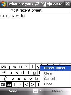 К сожалению, на Nokia 5320, где проходили испытания других участников нашего теста, Twibble установить не удалось из-за ошибки в сертификате приложения, поэтому тест пришлось проводить тест на PoverPC X7 – бесклавиатурном WM-коммуникаторе с непривередливой JAVA-машиной. Но, именно отсутствие клавиатуры не позволило оценить одно из главных удобств Twibble – хорошо развитое управление с помощью горячих клавиш. Зато благодаря сенсорному дисплею переключаться между лентой друзей, ответами, приватными сообщениями и результатами поиска можно скользящим движением пальцем. Еще одним плюсом Twibble является адаптация программы для минимального расхода трафика – в отличие от многих других JAVA-клиентов Twibble кэширует загруженные сообщения, а при обновлении лент – загружает только новые сообщения, а не всю ленту целиком. В бесплатной версии Twibble длина лент ограничена 10 сообщениями, что при активном использовании Twitter может доставлять некоторые неудобства. Еще одним раздражающим фактором бесплатного варианта программы являются сообщения с предложением купить полную версию Twibble.