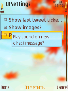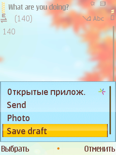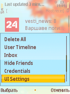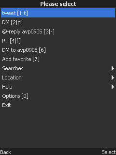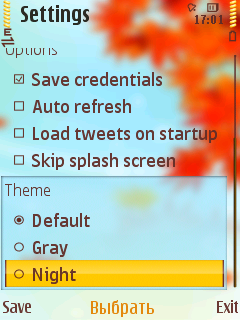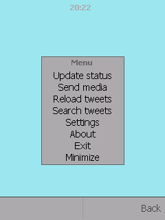 Ввод имени пользователя и пароля для доступа к сервису осуществляется при первом запуске приложения. Также при первоначальной настройке приложения можно сохранить логин/пароль доступа к Twitter в память телефона, включить автоматическое обновление лент сообщений, активировать загрузку новых сообщений при старте приложения, а также задать тему оформления. Для последующего изменения настроек программы служит пункт «Settings» меню вызываемого левой софт-клавишей. Также через меню «Setteings» можно перейти к созданию обычных сообщений («Update Status») или сообщений содержащих фото- видео материалы («Send media»). Причем для «медийных» сообщений можно не только сделать снимок камерой телефона, но и загрузить уже готовую фотографию или видеоролик. Выбор сервиса, на котором будет размещен «медийный» контент осуществляется при отправке сообщения.