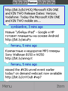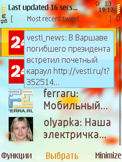Программа Tiny Twitter – это еще один пример простого приложения, ориентированного на использование на любых мобильных телефонах. Функционал Tiny Twitter вполне обычен – доступен просмотр лент сообщений (лента друзей, ответов и приватных сообщений), написание новых сообщений, ответы на сообщения, а также удаление сообщений. При первом запуске программы будет предложено ввести имя пользователя и пароль на доступ к сервису. Несмотря на простоту приложения, не обошлось и без нескольких приятных моментов. Во-первых, поддерживается переход по содержащимся в сообщениях ссылках. Во-вторых, присутствует автоматическое обновление лент сообщений с настраиваемым интервалом – через 4, 15,30 или 60 минут. В-третьих, можно настроить размер шрифта, которым отображаются сообщения в лентах. В-четвертых, можно просмотреть лишь ленту сообщений конкретного пользователя, что также достаточно удобно.