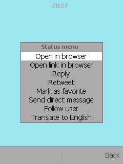 Основное диалоговое окно Twim представляет собой набор вкладок содержащих ленты собственных сообщений (Archive), ответов (Replies), ре-твитов (Retwits), друзей (Home), приватных сообщений (Direct), «избранное» (Favorites), а также ленту сообщений пользователей, следящих за вами, но не внесенных в список друзей. Последняя вкладка диалогового окна Twim содержит ленту открытых сообщений (Public). При просмотре сообщений доступно открытие ссылок в браузере телефона, написание ответов и ре-твитов, занесение сообщений в «избранное», отправка приватных сообщения, а также исключение отправителя исходного сообщения из списка «фолловингов». Из «экзотических» функций программы некоторый интерес вызывает функция перевода сообщений на английский язык, однако у меня эта функция корректно не заработала, возможно, из-за того, что используемый программой переводчик не поддерживает или не распознает русский язык.