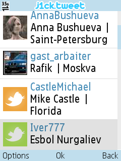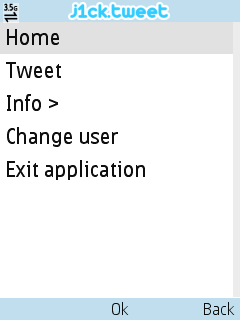 К минусам приложения можно отнести отсутствие функции автоматического обновлении ленты сообщений и то, что при каждой смене режиме просмотра j1ck.tweet обновляет списки сообщений, а это может создавать дополнительный расход трафика. При установке j1ck.tweet, данному приложению необходимо разрешить доступ к Интернет и указать имя пользователя и пароль на доступ к Twitter. После подключения к сервису, на дисплее телефона будет отображена лента друзей (Home) и строка создания нового сообщения. Доступ к остальным функциям программы осуществляется через меню Options, вызываемое левой софт-клавишей.