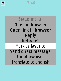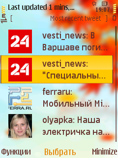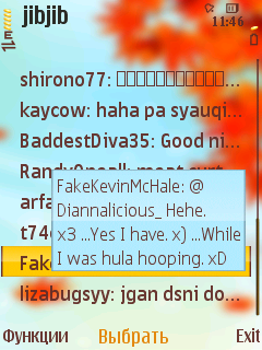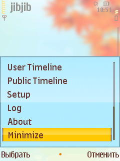 На мой взгляд, программа jibjib, в первую очередь, адаптирована для максимально удобного просмотра лент Twitter – поддерживаются просмотр лент друзей, ответов, приватных сообщений, избранного, сообщений отправленных текущим пользователем, а также ленты открытых сообщений. По умолчанию сообщения отображаются в одну строку, но если поставить курсор на любое из них на экране телефона будет отображено всплывающее окно с текстом сообщения. При щелчке по сообщению оно будет показано полностью в отдельном диалоговом окне, а переход к написанию ответа и занесение сообщения в «избранное» осуществляется через подменю «Функции», ассоциированное с левой софт-клавишей. Из «приятных мелочей» программы можно отметить функцию «minimize», позволяющую свернуть программу.