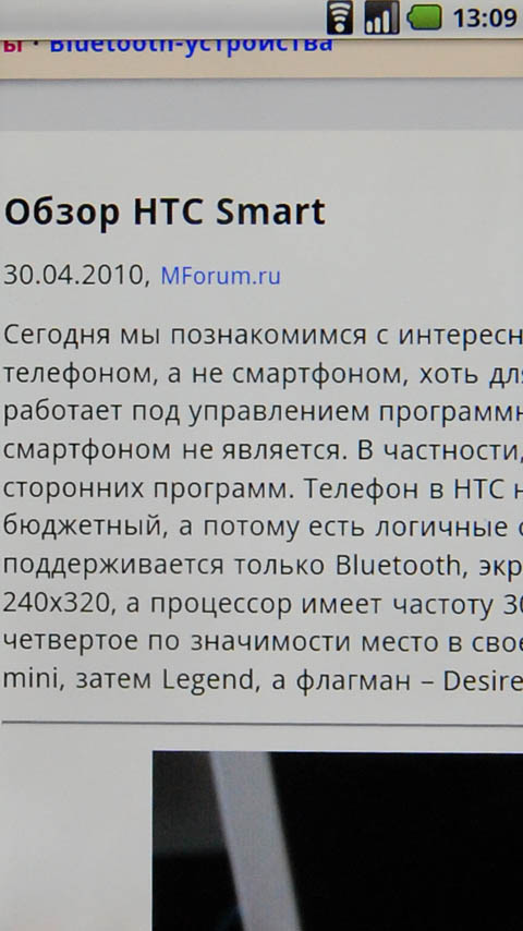 В целом, я бы не назвал систему очень быстрой: меню подтормаживает, программы запускаются не моментально, HTC Desire заметно быстрее. Видеоклип с разрешением 800х600 совсем не проигрывался, телефон зависал наглухо, помогало только вынимание аккумулятора. Видео с меньшим разрешением "глючило", подтормаживая каждые 5-10 секунд. Не все хорошо и с программной частью. Через некоторое время перестал запускаться Android Market. После сброса всех настроек – заработал, но позже – снова перестал. При установке анимированного фона рабочего стола меню телефона и рабочие столы ощутимо начинают тормозить - в Desire этого опять же нет. Возможно, все эти «проблемы» можно списать на то, что образец у нас был тестовый.