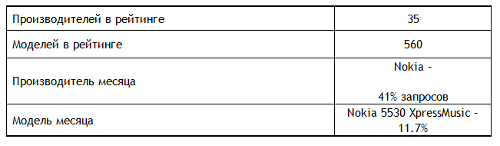 Третий месяц подряд количество производителей стабильно и составляет 35 имён. Однако количество моделей, участвующих в рейтинге, увеличилось до 560 единиц, что на 9 устройств больше, чем в предыдущем месяце. Телефоном месяца остался хит Nokia 5530 XpressMusic с рейтингом 11.7%. За месяц устройство, после недавнего спада популярности, прибавило 0.9%.