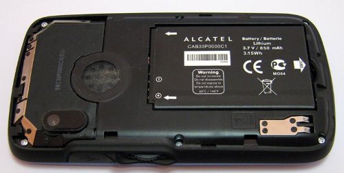 Аккумулятор Alcatel OT-800 расположен стандартно, под задней крышкой телефона, а для снятия батареи достаточно поддеть ногтем ее нижний торец. Емкость стандартного аккумулятора Alcatel OT-800 составляет 850 мАч, чего хватает на 2 дня очень активного использования или на 4-6 дней при работе с основными функциями устройства. Слот для SIM-карты расположен под аккумулятором, при этом для снятия SIM-карты необходимо потянуть ее вверх. Каких-либо проблем, связанных со сбросом текущей даты и времени при кратковременном снятии аккумулятора не наблюдается.