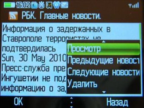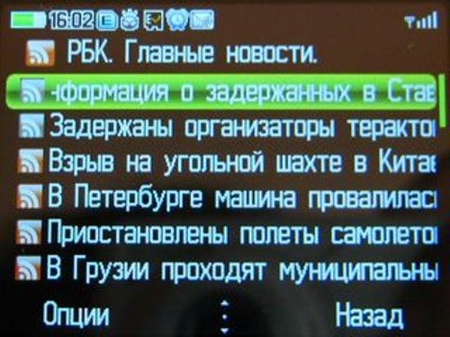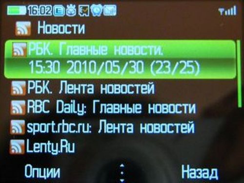 Предустановленная в Alcatel OT-800 программа чтения новостей является «нативной», поэтому ее запуск не вызывает необходимости закрытия запущенных JAVA-приложений, например, Opera Mini или IM-клиента. Каких-либо проблем с ее использованием во время теста у нас не возникло, ни при просмотре, ни при чтении RSS-лент. Но, серьезно разочаровало то, что просмотр оригинала новости открывается лишь во встроенном браузере, возможности которого более чем ограничены. При желании можно активировать отображение новостей на рабочем столе телефона и настроить их автоматическое обновление с интервалом 2,4, 8 или 24 часа.