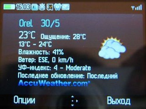 Не возникло проблем и с прогнозом погоды – он вполне корректно отображается и обновляется. При настройке приложения можно задать единицы измерения (английские или метрические), активировать автоматическое обновление с интервалом 6,12 или 24 часа, указать используемую точку доступа (при тестировании все корректно работало с параметрами «По умолчанию») и включить отображение прогноза на рабочем столе телефона. Источником прогноза является сайт AccuWeather.com.