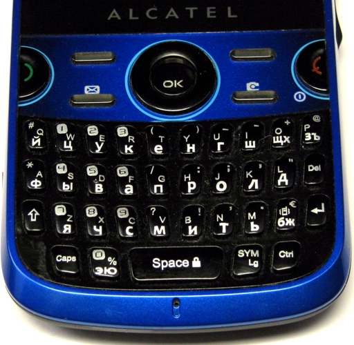 QWERTY-клавиатура Alcatel OT-800 выполнена в виде набора отдельных клавиш, разнесенных друг относительно друга примерно на 1 мм. Ход клавиш небольшой, с четко ощущаемым щелчком при нажатии. Без привычки использование QWERTY-клавиатуры Alcatel OT-800 может показаться немного неудобным, но буквально после недели использования каких-либо неудобств при наборе текста не возникает. Блокировка клавиатуры осуществляется длительным нажатием пробела, а разблокировка – последовательным нажатием пробела и левой софт-клавиши. Основное замечание к клавиатуре эстетическое – при ношении в карманах между клавишами попадают частицы пыли, что придает аппарату не самый аккуратный внешний вид.
