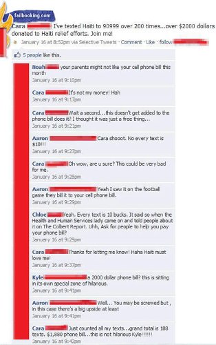 Девочка по имени Кара очень гордилась собой. Еще бы – ведь она отправила целых 188 SMS в помощь пострадавшим от землетрясения жителям Гаити на общую сумму около $2000. Вот только одного она не знала – что выкладывать «помощь» придется из собственного кармана. Когда девочка опубликовала сообщение о собственной «благотворительности» на Facebook, ее друзья посоветовали посмотреть в следующем месяце счет за мобильную связь. И оказались правы.