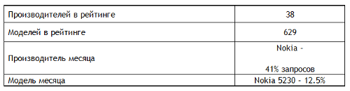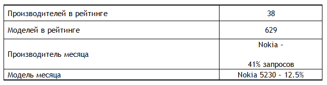 38 компаний – производителей сотовых телефонов и 629 моделей устройств участвовало в февральском рейтинге, это на один бренд и 9 моделей больше, чем месяцем ранее. О компании месяца вопрос не стоит, модель месяца также не изменилась - Nokia 5230 с минимально подросшим рейтингом (12.5%; +0.1%).