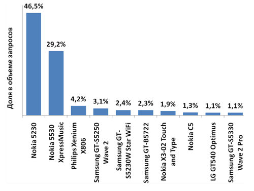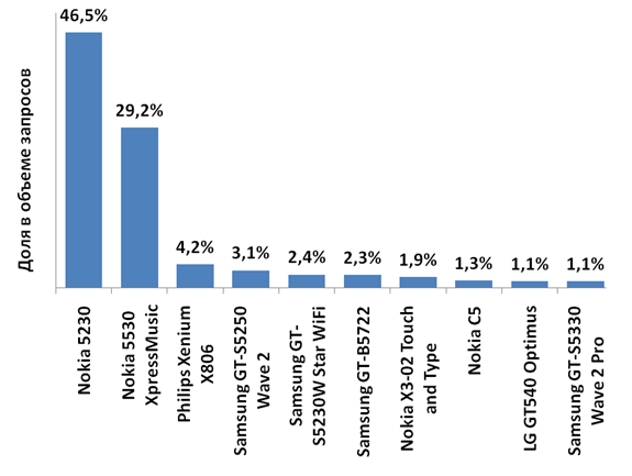Пятёрка лучших телефонов февраля на российском рынке следовала консервативным тенденциям: Nokia 5230, Nokia 5530 XpressMusic, Samsung GT-S5230, Sony Ericsson XPERIA X10, Sony Ericsson XPERIA X8. Доля рынка этих устройств составила 37.8%, что на 1.4% больше январского показателя.