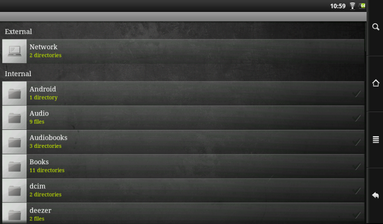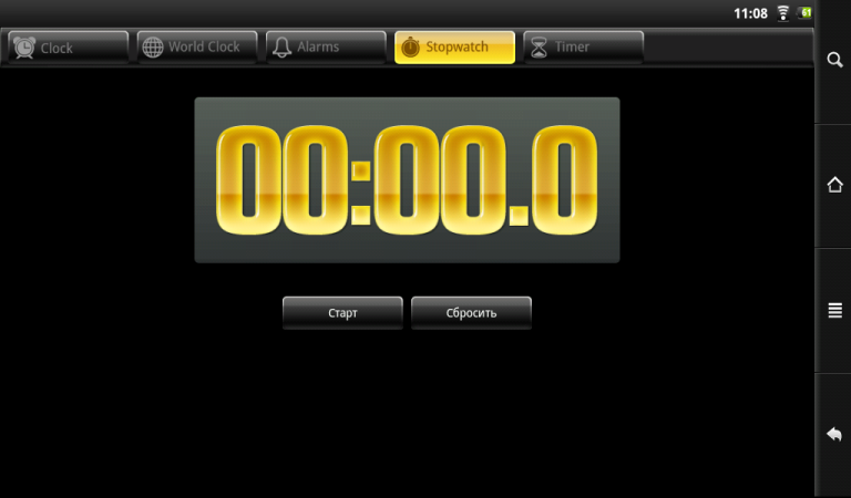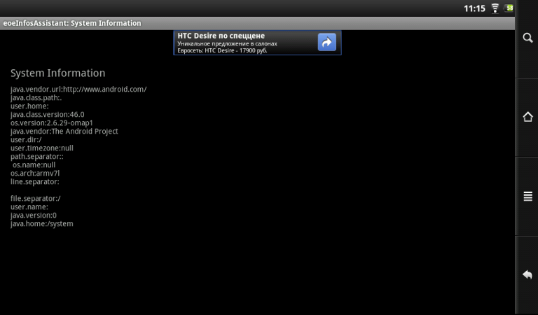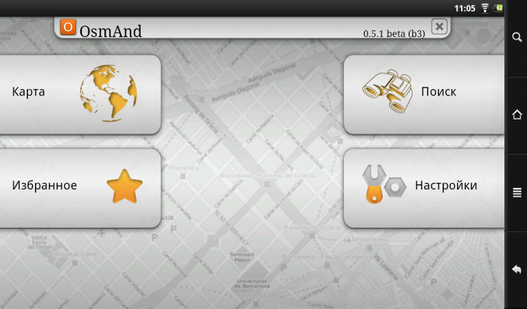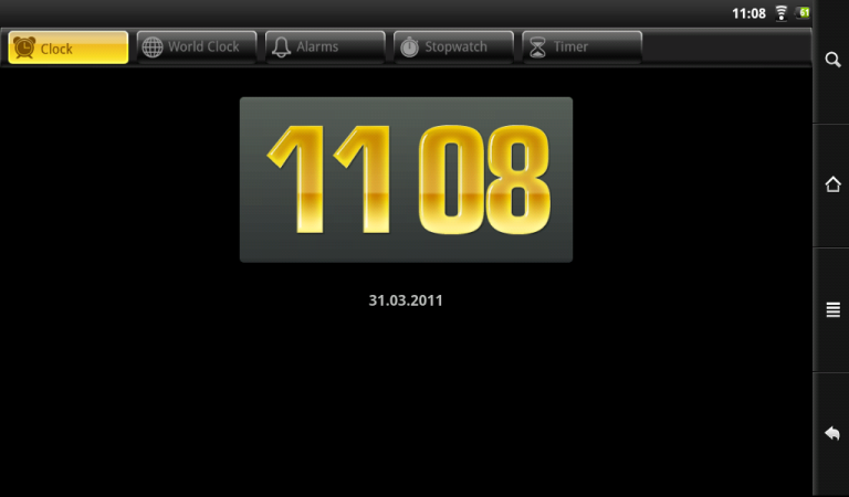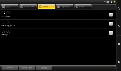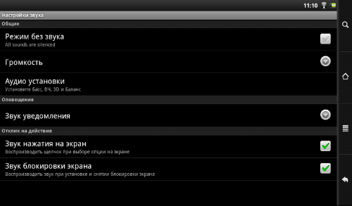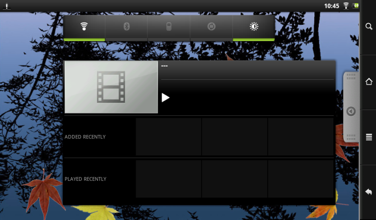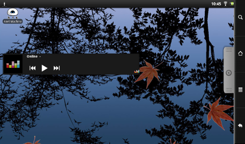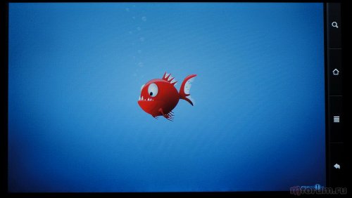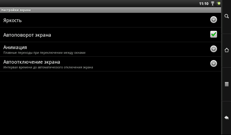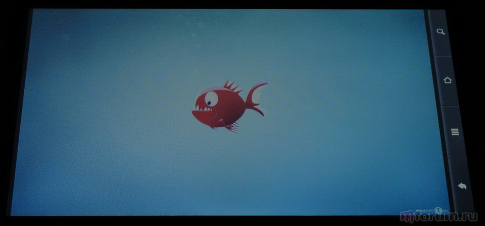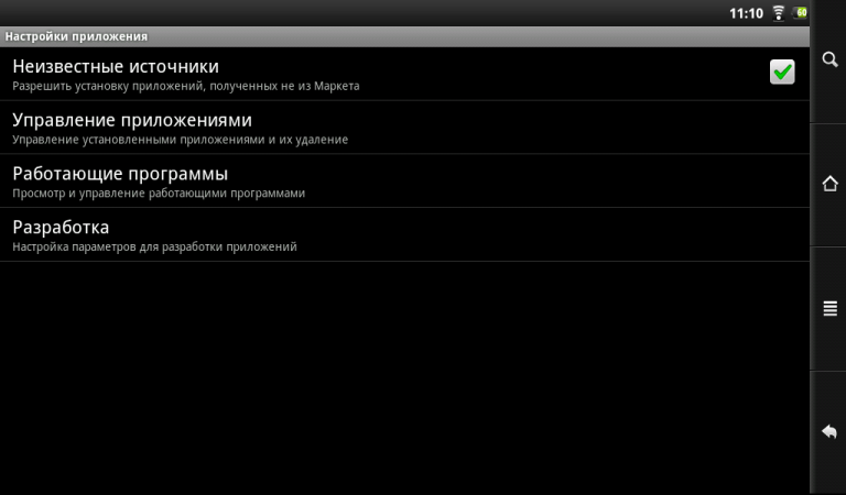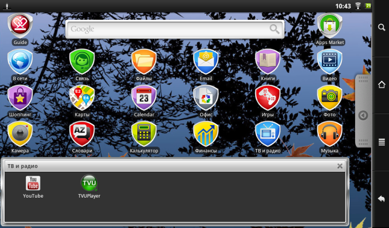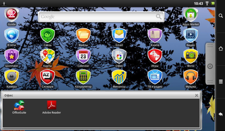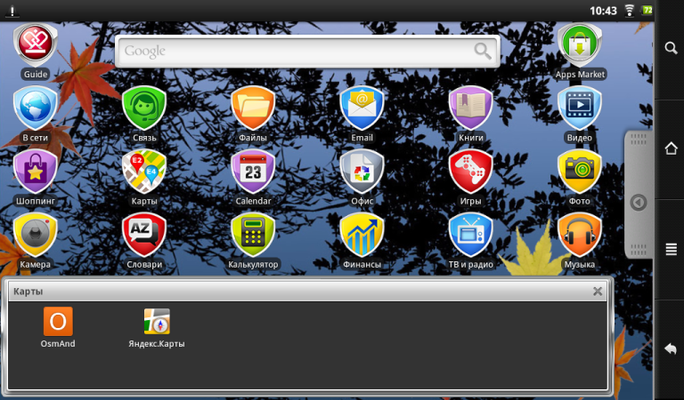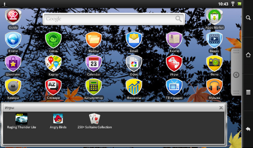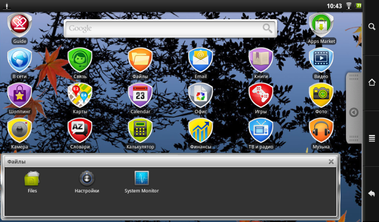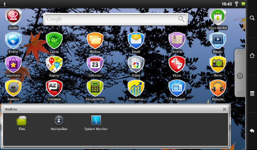 Справа закреплена панель: «поиск», «домой», «меню» и «назад». Для того чтобы попасть в список приложений, необходимо нажать на выезжающую панель, она опять же справа. Ярлыки и виджеты можно вынести на один из трех рабочих столов. Например: