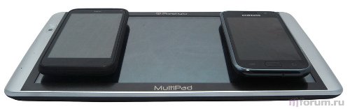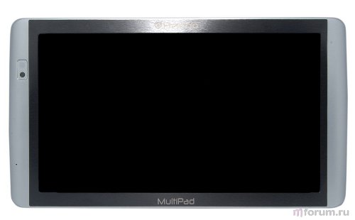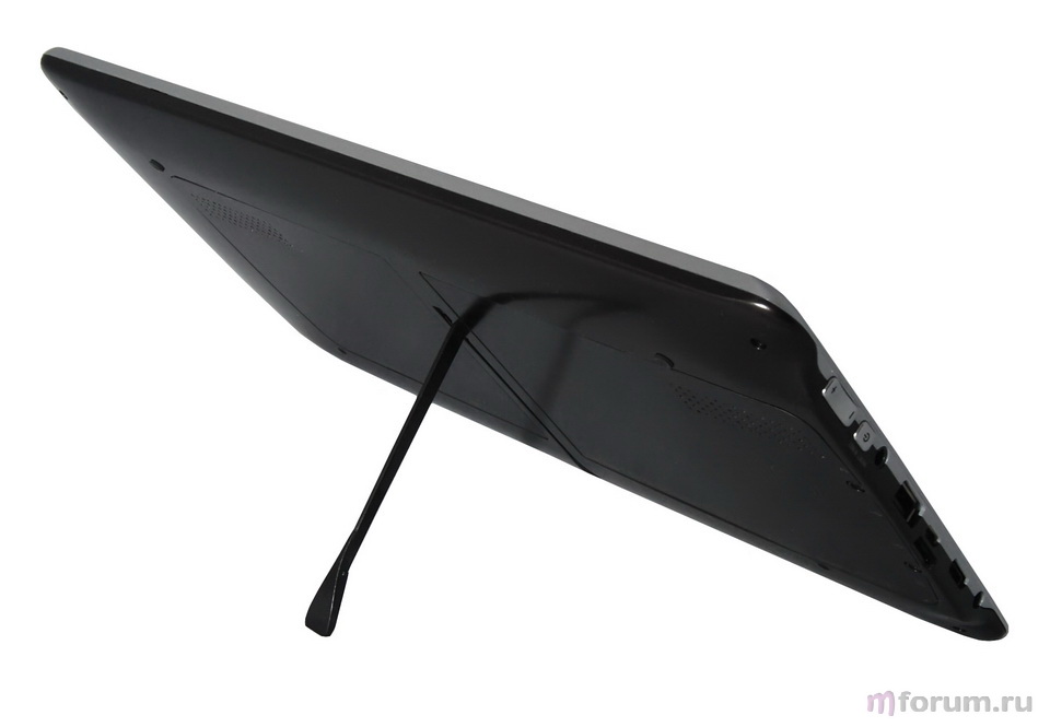 Видимо, для уменьшения стоимости и веса аппарата весь корпус выполнен из пластика. Увы, но на ощупь он не вызывает доверия: на вид - дешевый, в руках аппарат похрустывает, особенно если одной рукой держать, а другой нажимать на экран. Для того чтобы более комфортно пользоваться планшетом, производитель установил на задней части выдвижную «ножку», MultiPad может располагаться на столе под углом от 20 до 80 градусов.