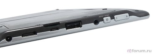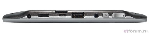 Основные элементы управления и разъемы производитель установил на левом торце: небольшая клавиша-качелька регулировки громкости, клавиша включения/выключения питания и индикатор заряда, 3.5 мм разъем для подключения наушников, стандартный USB-разъем, microUSB, разъем для установки microSD-карты памяти, miniHDMI и разъем для подключения зарядного устройства.