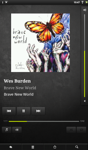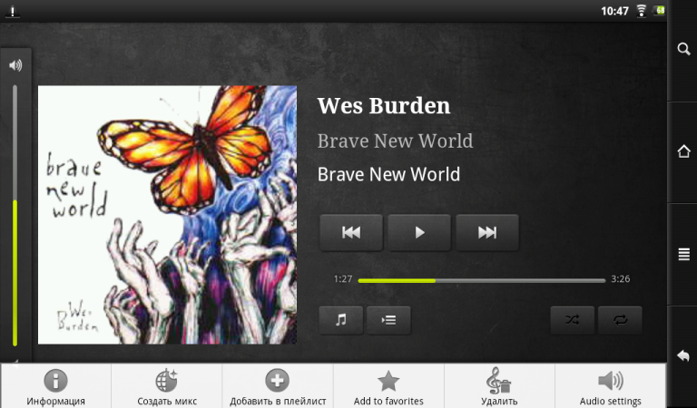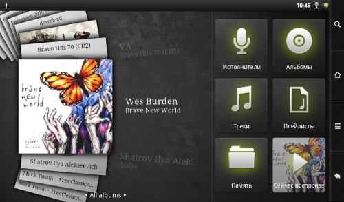 При проигрывании композиции на экране отображается огромная обложка альбома на половину экрана, на второй половине – имя исполнителя, название альбома и система управления плеером.