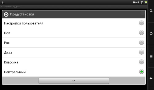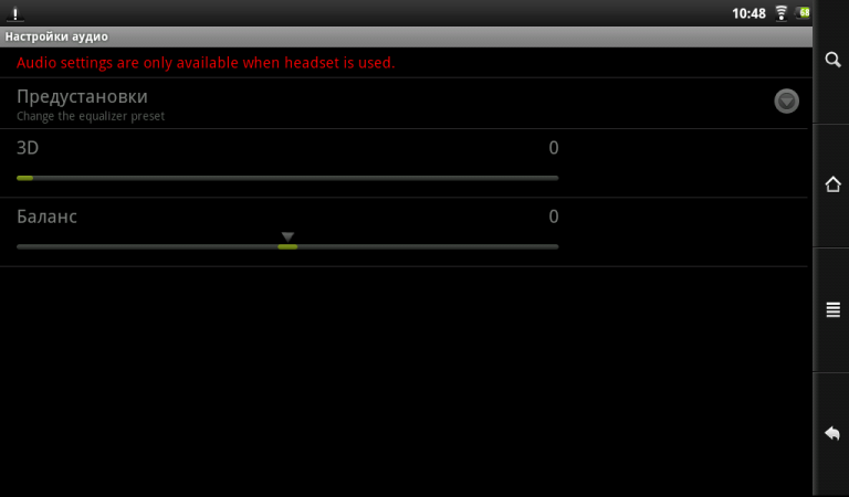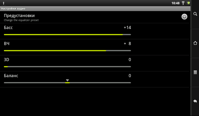 Если присоединить наушники, то можно настроить простой эквалайзер с четырьмя параметрами: бас, высокие частоты, 3D и баланс. Кроме этого вы можете выбрать один из готовых пресетов.