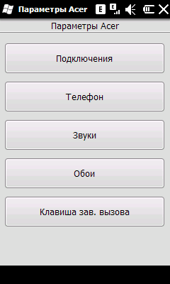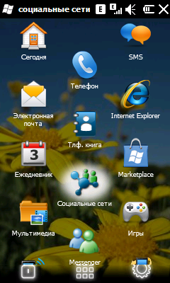 При нажатии на сенсорную кнопку по центру внизу вы попадаете в стандартное меню Windows Mobile 6.5.