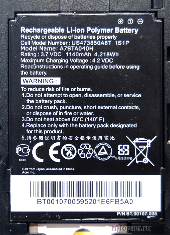 Первое время Acer работал в среднем около 3-х дней при средней нагрузке. Спустя примерно год, время «жизни» девайса сократилось вдвое. На данный момент при 20 минутах разговоров, написания около 10 сообщений, использования камеры в течение 20 минут и просмотра Google Карт со включенным GPS-приемником около 20 минут - Acer E101 придется заряжать уже к вечеру.