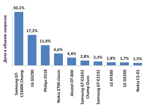 В сегменте бюджетных телефонов произошло довольно значимое событие – в тройке лидеров долгое время находился недорогой QWERTY-аппарат Alcatel OT-800, присутствие которого на лидирующих позициях с высоким рейтингом означало стабильную популярность текстовых сообщений – так как лишь для этого годился нескромных размеров аппарат, между тем, довольно удобный для общения в IM и набора SMS. В мае популярность аппарата упала в три раза, и он переместился на пятую позицию, уступив своё второе место бюджетному тачфону от LG. А сразу на третью позицию вышел телефон от Philips – стильный и симпатичный тачфон Philips Xenium X518, потерявший в цене и опустившийся в нижний ценовой сегмент. И теперь тройка самых популярных телефонов среди самых доступных состоит из трёх «сенсориков». Событие знаковое, этот момент можно смело считать завершением глобального перехода рынка мобильной связи на сенсорные аппараты. Конечно, «клавишники» обязательно будут присутствовать в рейтингах и прайс-листах, однако их количество плавно уменьшится до уровня, необходимого для поддержания предложения среди людей, не приемлющих сенсорные аппараты.