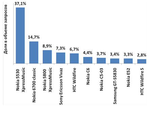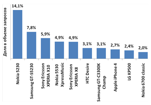 А в тройке самых популярных телефонов ничего не изменилось – преимущество лидера сегмента Nokia 5230 возросло и второй год аппарат не покидает тройку лидеров.