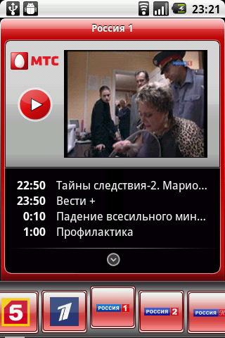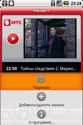 При просмотре телепередач для управления приложением служит меню, вызываемое при касании дисплея. В режиме просмотра можно выбрать качество (HQ - 348 кбит/с или LQ - 207 кбит/с), растянуть изображение на весь дисплей телефона, уменьшить/увеличить громкость (также для этой цели могут использоваться аппаратные клавиши регулировки громкости) и вернуться в меню выбора канала. Но самая интересная функция «MTS TV» - поддержка режима «картинка в картинке», благодаря чему можно, не переключая текущий канал, узнать какие передачи идут по другим каналам.