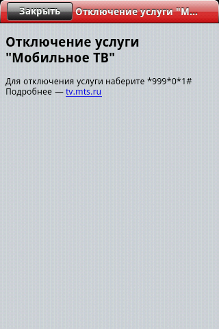 Как и любую другую услугу от МТС подключить или отключить «Мобильное ТВ» можно несколькими способами - через USSD-команды (подключение *999#, отключение *999*0*1#), sms-запросы (подключение sms c текстом «1» на номер 999, отключение «01» на номер 999), мобильный портал (подключение *111*9999#, отключение *111*9999*0*1#) или интернет-помощник. Но, независимо от использованного способа, при подключении услуги абонент получит sms-сообщение со ссылкой на загрузку приложения. Чтобы получить ссылку на загрузку приложения «MTS TV» без подключения услуги «Мобильное ТВ» можно воспользоваться USSD-командой *111*720#. Если приложение установлено, а услуга не подключена, то для ее подключения можно использовать кнопку «Подписаться» отображаемую в основном диалоговом окне программы «MTS TV». Напоминание о способе отключения услуги доступно в пункте «Подписки» меню приложения.