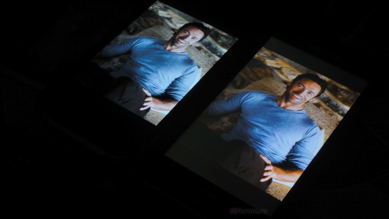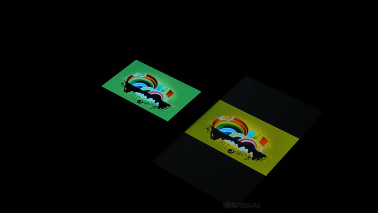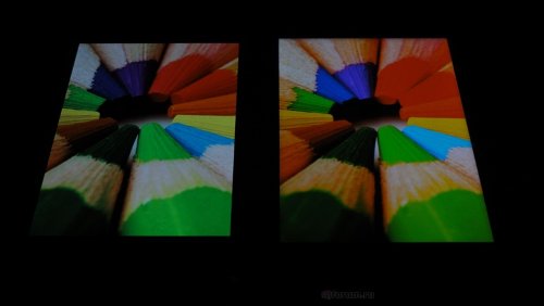 В настройках дисплея присутствует пункт "Режим экрана", который содержит параметры цветовой температуры матрицы. При установке "динамического" режима на максимальной яркости экран приобретает розоватый оттенок, причем, желтые, розовые и зеленые цвета на определенных фотографиях либо сливаются, либо выглядят неестественно. В режиме "стандартно" картинка выглядит чуть лучше, но цвета все равно искажаются. "Фильм" - наиболее подходящий режим цветовой температуры дисплея. Углы обзора экрана максимальные, однако всю картину портит не идеально черный цвет SLCD-матрицы.