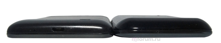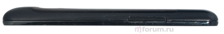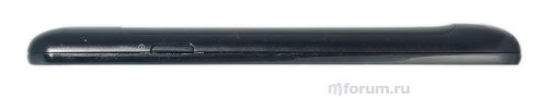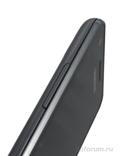 На верхней части лицевой панели находится речевой динамик. Запас по громкости большой, собеседника слышно даже в метро или на шумной улице, голос передается четко. Там же располагаются два датчика: освещения и приближения. А левее – большой глазок фронтальной камеры. Кнопка «домой» - механическая, утоплена в корпус, нажатие легкое с характерным «кликом». Слева от нее разместилась сенсорная клавиша «меню», а справа – «назад». В отличие от предыдущих младших моделей эти две клавиши видны только при включении подсветки экрана. Регулировать громкость можно клавишей-качелькой на левом боку телефона, а на правом находится небольшая клавиша включения/выключения.