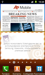 Используется фирменная оболочка TouchWiz версии 4.0. Более подробно про нее вы можете прочитать в обзоре Samsung Galaxy i9100. Однако отмечу, что главный экран имеет 7 виртуальных рабочих столов, на которые можно вынести папки, ярлыки, виджеты и горячие клавиши. В отличие от предыдущих версий оболочки, виджеты и ярлыки вместо списка отображаются иконками в нижней части экрана и прокручиваются либо влево, либо вправо.