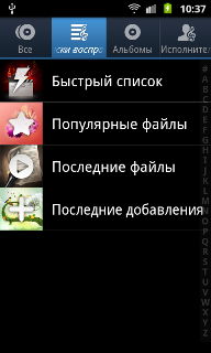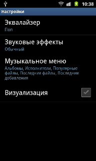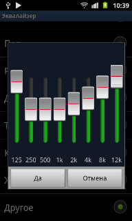 Симпатичный проигрыватель музыкальных файлов. Позволяет сортировать композиции по альбомам, спискам воспроизведения и по исполнителям. В отличие от предыдущих версий программы, имеется красивое фоновое оформление. На экране отображаются название композиции, управление громкостью, шкала перемотки. В настройках пользователю доступен быстрый список, отправка музыки (через сообщение MMS, Bluetooth, электронную почту и Wi-Fi), установка в качестве мелодии звонка или смс. В дополнительных опциях присутствует эквалайзер с 7-ю готовыми пресетами и одним настраиваемым. К сожалению, нижний порог низких частот составляет 125 Гц, а верхний – 12 кГц. На дворе 21-й век, а в плеерах все еще устанавливают «хилые» эквалайзеры.