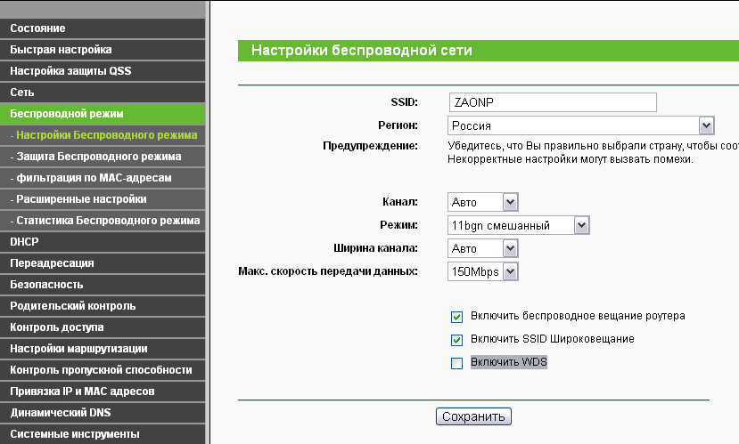 Второй шаг настройки роутера – конфигурирование беспроводной сети, для чего щелкают по пункту «Беспроводной режим» web-интерфейса управления маршрутизатором. В пункте «Настройки беспроводного режима» задают базовые настройки:
