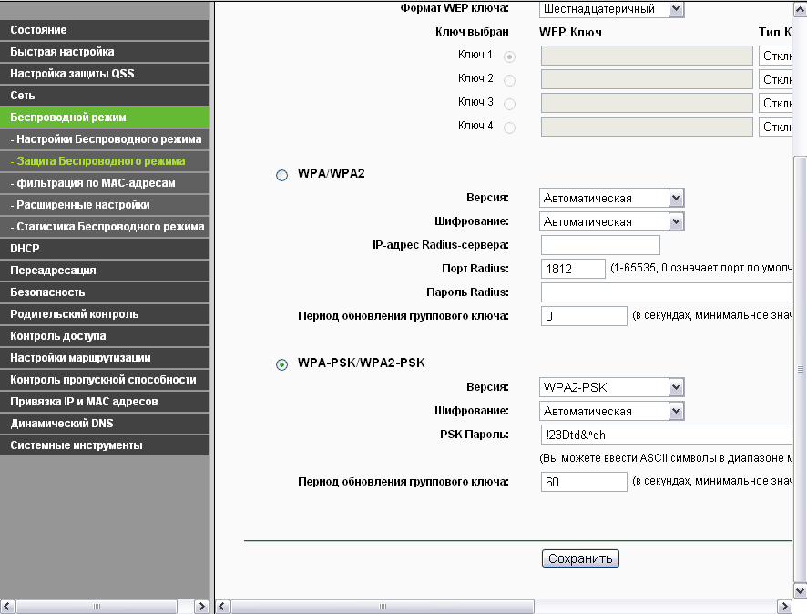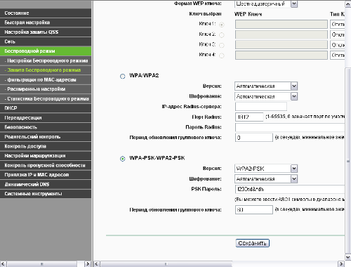 Очень важный шаг – настройка безопасности беспроводной сети. По умолчанию, рассматриваемый маршрутизатор (как и большинство его аналогов) поддерживает разные режимы защиты беспроводной сети – от полностью открытой до WPA2. Однако, если вы хотите создать хотя бы минимально безопасную беспроводную сеть без использования Radius-сервера, следует выбирать режим «WPA-PSK/WPA2-PSK». Настоек в этом режиме немного: