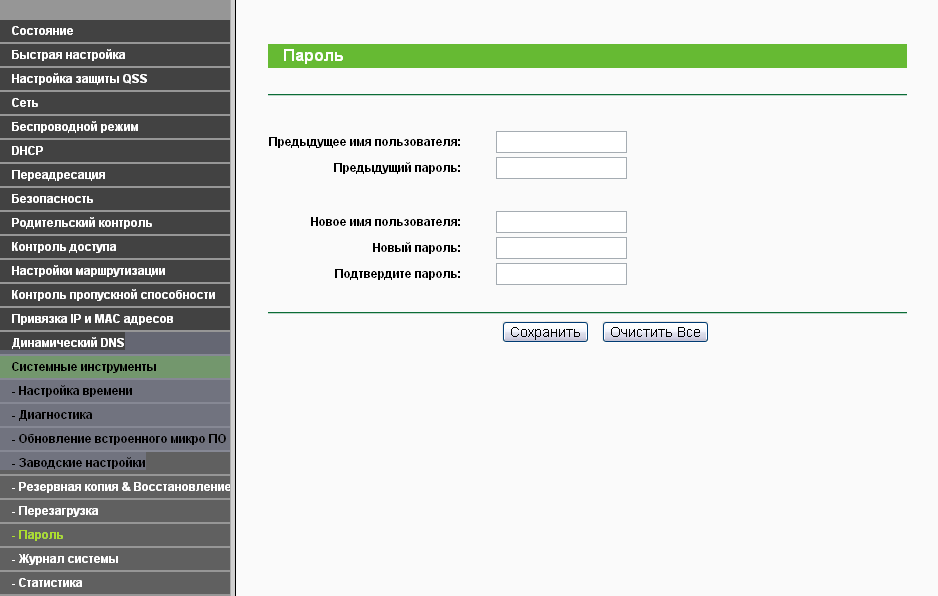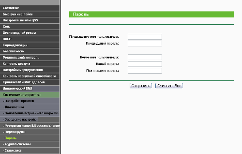 Из системных настроек самого маршрутизатора наиболее важна возможность смены пароля для доступа к web-интерфейсу управления устройством, что делается через одноименный пункт подменю «Системные инструменты» web-интерфейса. Для смены пароля понадобится ввести текущую пару логин-пароль, а также их новые значения.