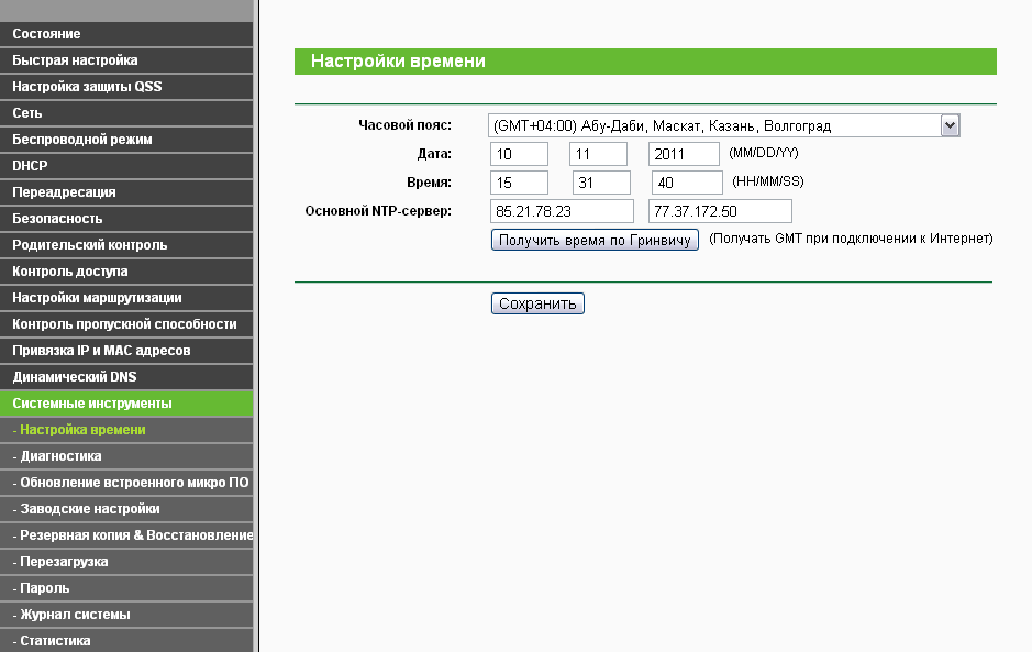 Для корректной работы ограничений с привязкой ко времени, в «Системных инструментах» можно задать текущее время маршрутизатора и адреса NTP-серверов. Например, для этой цели можно использовать 0.ru.pool.ntp.org и 1.ru.pool.ntp.org, соответственно доступные по IP-адресам 85.21.78.23 и 77.37.172.50. Кстати, обратите внимание – для корректного получения времени по Москве в качестве часового пояса следует выбирать «GMT+04:00».