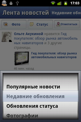 Для навигации между новостями, сообщениями, друзьями, группами, фотографиями и другими объектами этой социальной сети служит основное меню приложения. Там же можно узнать, кто есть поблизости, и перейти к управлению собственным профилем и фотоальбомом. Причем добавлять фотографии и видео можно как из галереи, так и непосредственно с камеры устройства. Кстати, добавить фотографии или видео можно и из основного диалогового окна приложения. Также у «Facebook для Android» есть собственный виджет для рабочего стола.