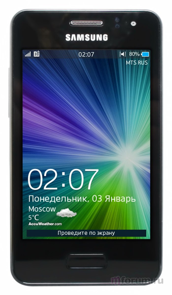 Для разблокировки экрана Samsung Wave M необходимо нажать на кнопку включения или «меню» и далее сдвинуть в сторону картинку «экрана блокировки». При получении нового сообщения на экране блокировки появляется специальный «бар», на который надо нажать и переместить с правой стороны на левую, а если пропущен вызов – наоборот. Также на «экране блокировки» отображаются время, дата и день недели.
