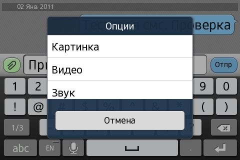 Для прикрепления к сообщению картинки, видео, звука, контактов или календаря, необходимо нажать иконку скрепки слева от поля ввода текста.