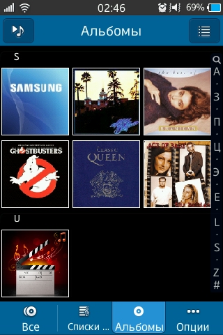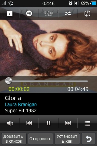 На экране появляется список, отсортированный по категориям: все треки, списки воспроизведения, альбомы, исполнители, жанры и папки. Вверху слева – переход к управлению плеером, справа – удаление композиции. При воспроизведении музыки: сверху - информация о файле, AllShare, переключение на 5.1, проигрывание по кругу и так далее; ниже – альбом, временная шкала, управление плеером. Если повернуть телефон на бок – плеер переключится в режим CoverFlow (выбор музыки по обложке альбома, как в Apple iPhone).