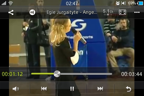 После запуска приложения на дисплее отобразится список всех поддерживаемых видеофайлов. Опытным путем удалось выяснить, что Samsung Wave M проигрывает только MP4- и 3GP-файлы, причем разрешение должно быть не больше 640х480 (или где-то в этом диапазоне). Во время проигрывания доступна перемотка, отправка (в сообщении, по электронной почте и т.п.), расшаривание, включение 5.1-звука и настройка аспекта. Дополнительно – сведения о файле.