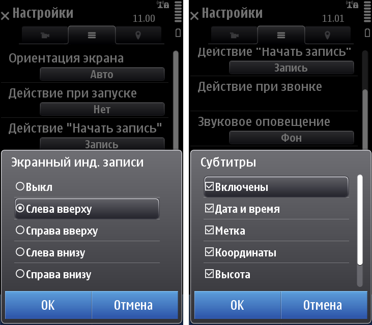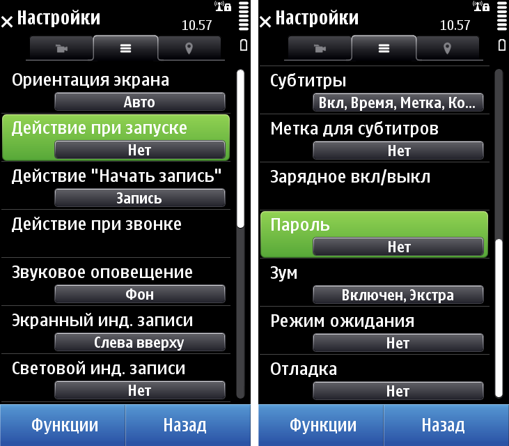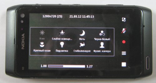 Для перехода в режиме видеосъемки понадобится нажать экранную кнопку с изображением видеокамеры. При желании, выбрав в настройках приложения соответствующий режим, можно активировать автоматический переход в режиме видеосъемки или записи видео при запуске приложения. Также доступен фоновый режим видеозаписи. Однако, при съемке видео в фоновом режиме, в зависимости от производительности устройства и выбранных параметров видеозаписи, возможны «тормоза» в работе смартфона. Например, на Nokia N8, который использовался при тестировании SymDVR, при фоновой съемке HD-видео интерфейс ОС и другие приложения работают существенно медленнее.