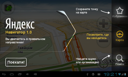 При первом запуске «Яндекс.Навигатор» отображает заставку со схемой расположения управляющих элементов, а для входа приложение нажимают кнопку «Поехали».