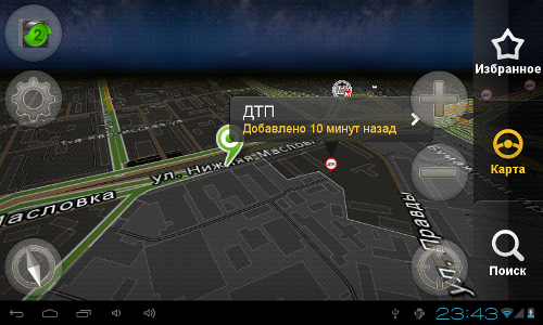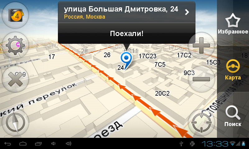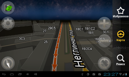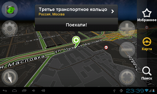 Интерфейс основного диалогового окна «Яндекс.Навигатор» состоит из трех вкладок – «избранное», «карта» и «поиск», при этом по умолчанию отображаются вкладка содержащая карту. Также на этой вкладке присутствуют кнопки изменения масштаба и другие управляющие элементы. Просматривать карту в «Яндекс.Навигатор» достаточно удобно – поддерживается увеличение/уменьшение и поворот карты с помощью соответствующих мультитач жестов. Кроме того присутствуют кнопки включения/выключения отображения загруженности дорог (на ней же индицируется текущая загрузка) и перехода к текущему местоположению. Еще одна приятная особенность – автоматический переход на ночной режим в темное время суток.