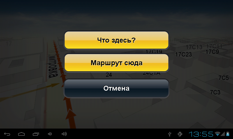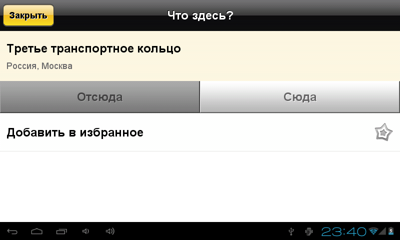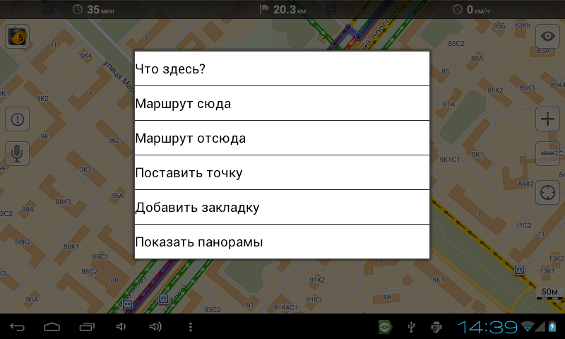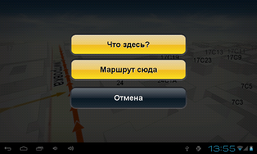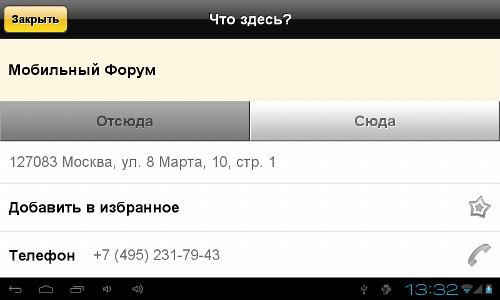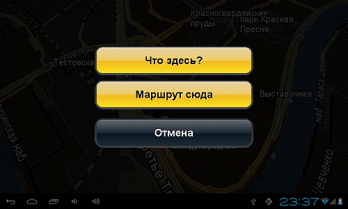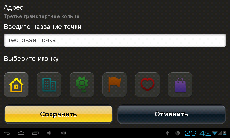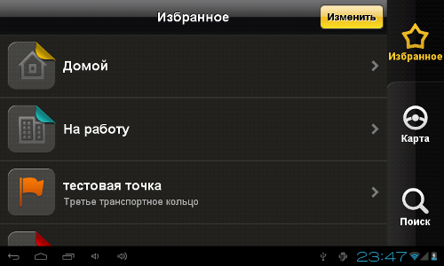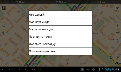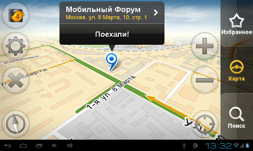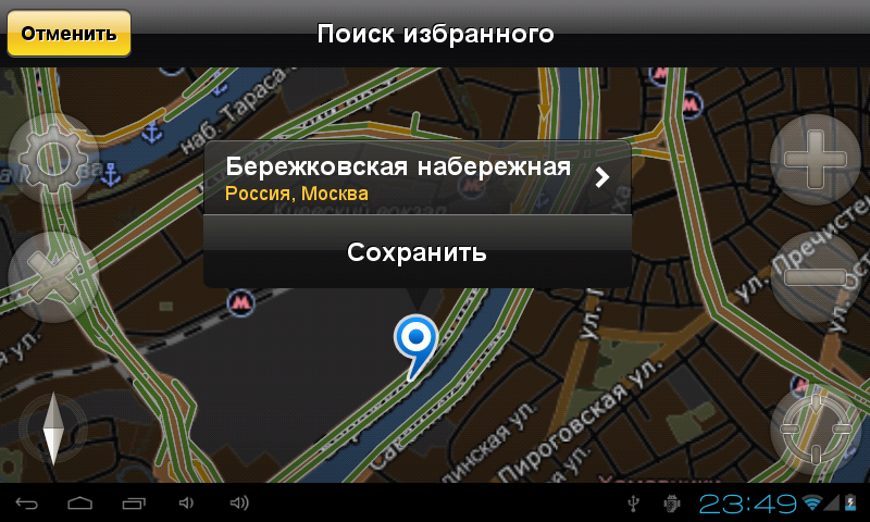 При длительном касании дисплея отображается меню, позволяющее получить подробную информацию о выбранной точке карты, занести ее в избранное и проложить маршрут. При занесении точки в избранное ей можно присвоить произвольное имя и выбрать иконку. Для последующего доступа к «избранным» точкам служит одноименная вкладка интерфейса приложения.